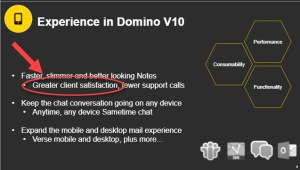 After some introductions, IBM/HCL launched into their presentation. The first slide that caught my attention was titled “Experience in Domino V10:”